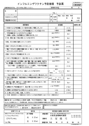 インフルエンザワクチン予防接種 予診票 用紙